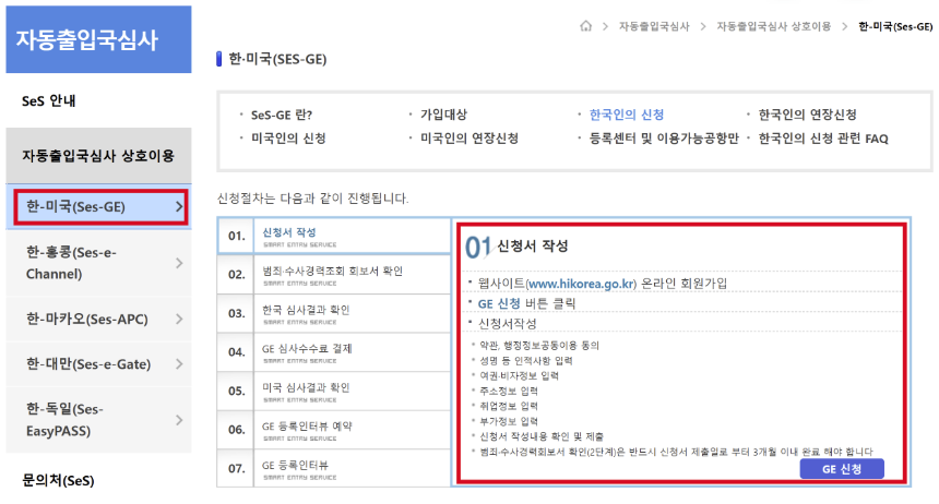 | 1단계 | HiKorea(하이코리아) 사이트 접속 → 자동출입국심사 → 한·미국(SES-GE) |